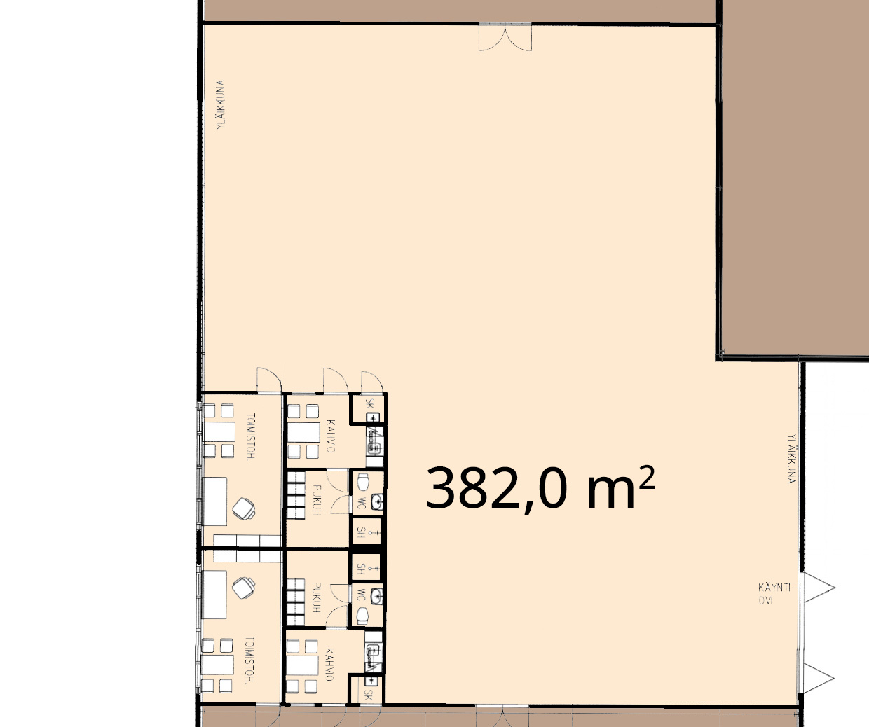 Korkea hallitila sopii hyvin varasto/ pienteollisuus / korjaamo yms. monitoimitiloiksi. Korkealla nosto-ovella varustetussa hallissa on vesi, viemäri, lämmitys, voimavirta ja wc.